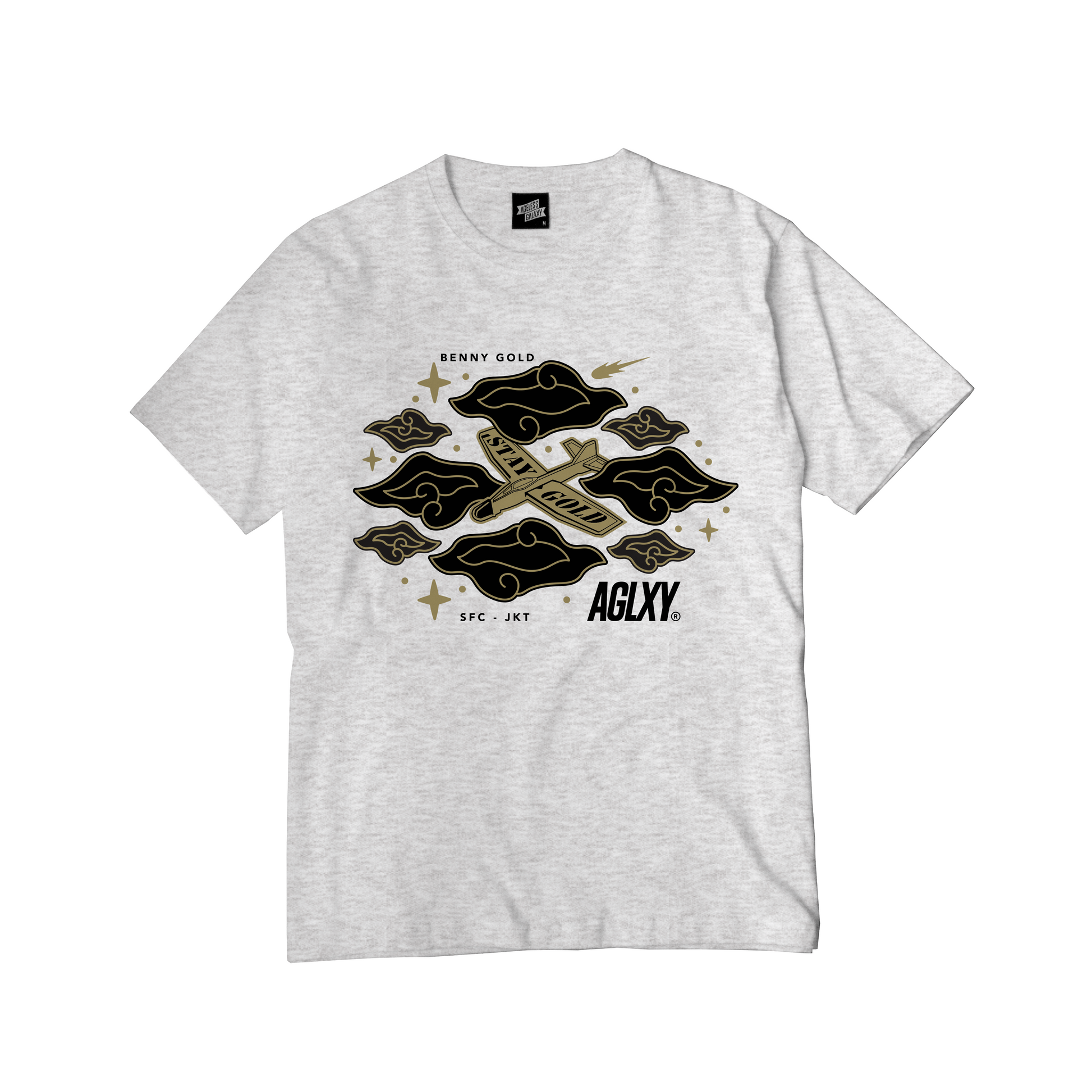Glide Through The Clouds tee features the Stay Gold glider graphic gliding between Indonesia's Mega Mendung cloud design screen printed on the front chest and the Benny Gold paper plane screen printed in gold on the upper back.
